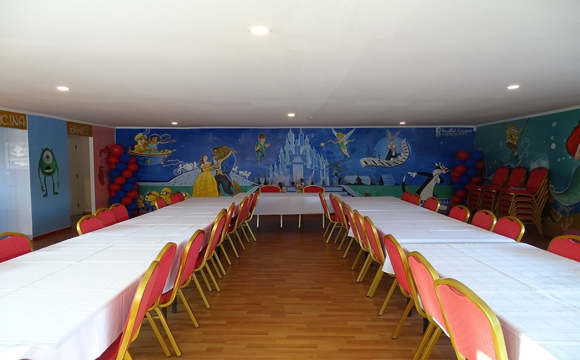 En Cisnes de Palmares tenemos a disposición de tu evento un amplio salón para 80 personas adornado con las mas famosas figuras del mundo de los dibujos animados. Contamos con un amplio juego de toboganes, cama elástica y juego inflable asegurando la diversión de tus invitados. También ponemos a tu disposición una máquina para elaborar palomitas de maíz.
