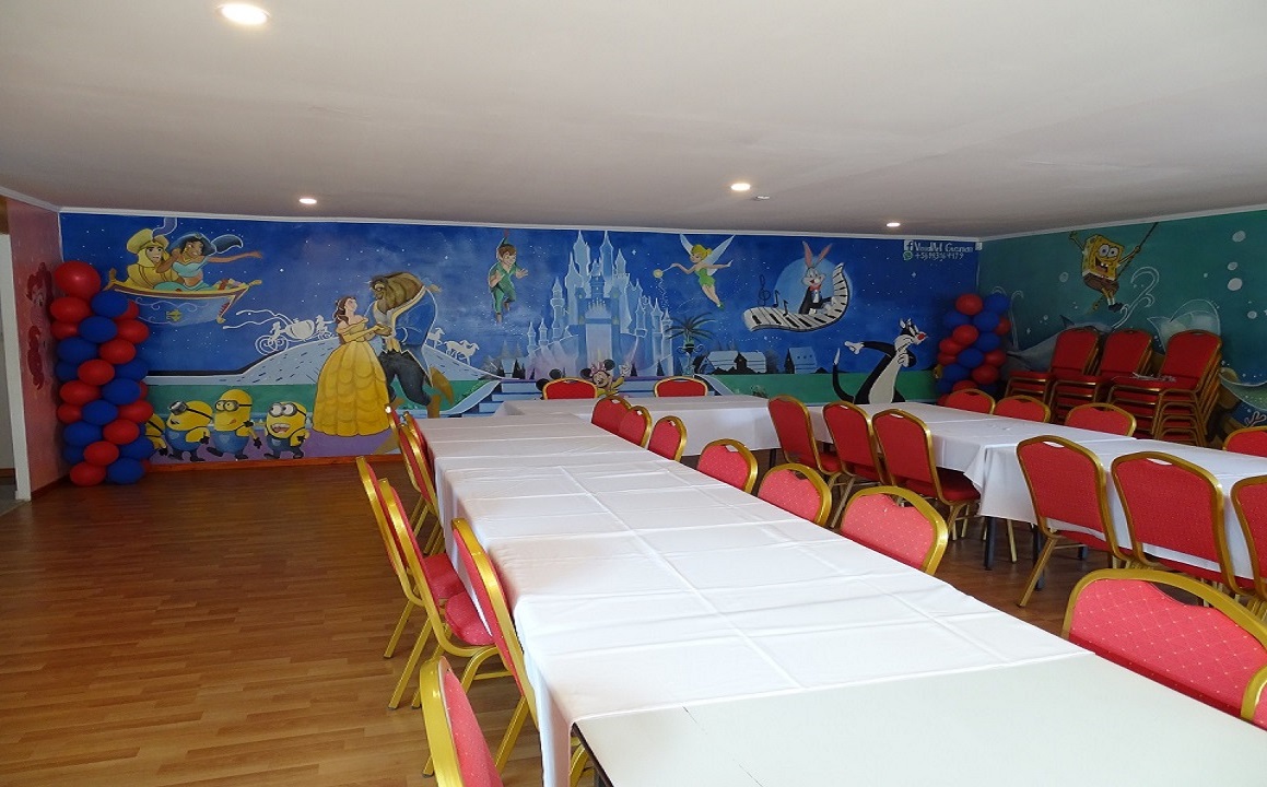 En Cisnes de Palmares tenemos a disposición de tu evento un amplio salón para 80 personas adornado con las mas famosas figuras del mundo de los dibujos animados. Contamos con un amplio juego de toboganes, cama elástica y juego inflable asegurando la diversión de tus invitados. También ponemos a tu disposición una máquina para elaborar palomitas de maíz.